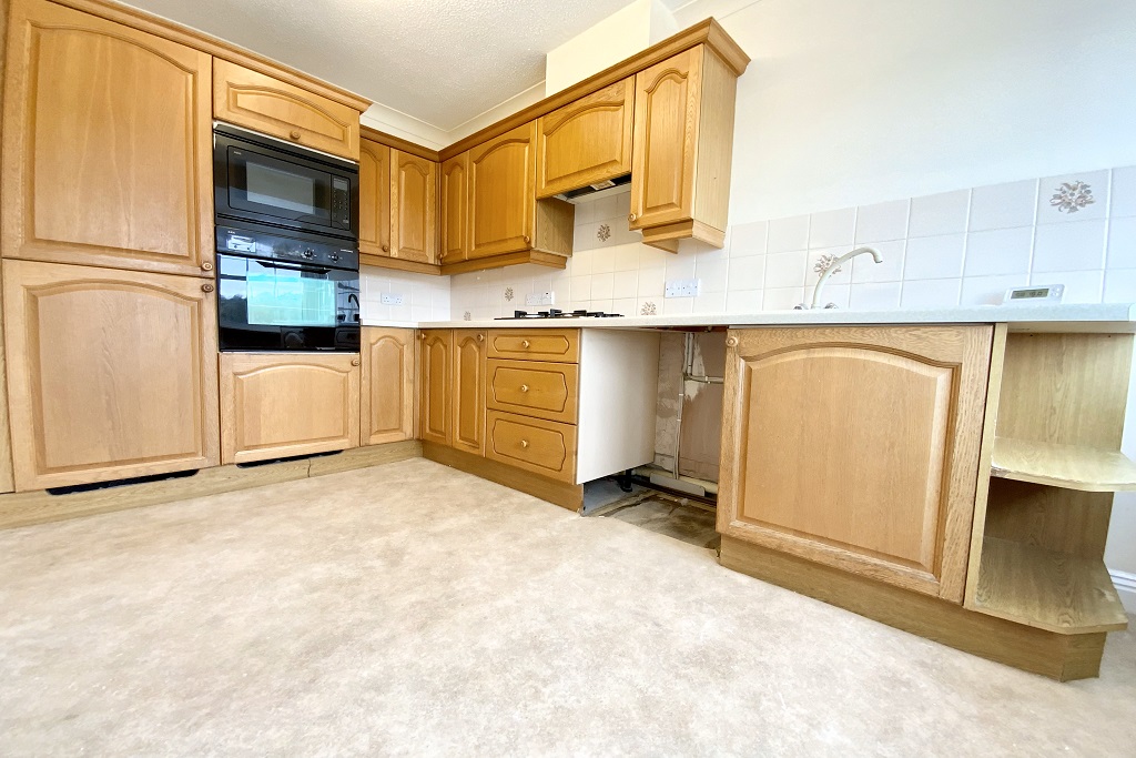 - Kitchen with built-in electric cooker, gas hob, fridge/freezer, breakfast bar and plumbing for washing machine
